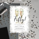 This is an elegant and chic 50th Birthday Party invitation featuring a silvery glitter border, a pair of watercolor champagne glasses and a modern script font. This would be perfect for anyone looking to celebrate their special milestone birthday in style.