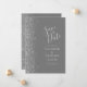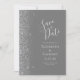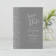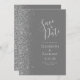 Det moderna bröllop spara datum-kortet från elegantens lämnat kant har ett silver faux glitter gräns. Med anpassadet kombineras handskrift av silver grått, tryckplåt och kursivt typsnitt på grått-bakgrund. Baksidan har en matchande grått- och silver-design.