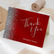 Den här eleganten är bröllop tack vare ditt kort ett gräns i silver faux glitter på en krimson röd bakgrund. Anpassadet kombinerar ord "Tack" i handskriftsskriptet silver grått och namn i briden och trimmen med kursivt teckensnitt.