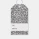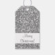 Snyggt digitalt skapat bildimitering av silver glitter mönster. På framsidan står "God jul!" och på andra sidan finns det ett textområde för anpassadet för namnen av presentmottagaren och presentdonatorn. Obs! Den här produkten är inte tillverkad av äkta glitter. Den har bara en utskriven bild som ser ut som silver glitter.