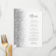 Den moderna bröllop-menyn på den lämnat kant i eleganten har ett faux silver glitter gräns. Anpassadet kombinerar handskript för grått och sans serif-teckensnitt på en vit bakgrund. Den omvända sidan har en matchande vit- och silver-glitter-design.