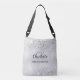 En modern falsk silver metallisk bakgrund. Dekorerad med falskt glitterstoft. Personifiera och lägg till ditt förnamn, monograminitialer och fullständigt namn. Namnet skrivs med en handskriven stilsnurr.