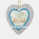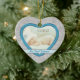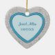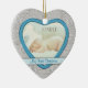 Den här prydnadsfärgen i helgdag har ett eget baby-foto som är inramat i ett söt blått hjärta ram inklädt i silver. Kärnan ram gränsar till en silver grått-blommigt-snurrande mönster. En ljusblå banderoll innehåller din anpassade text. Gör det spelar ingen roll att du vill! Baksidan av dekoratet har samma silver-snurra mönster gräns och hjärtformade ram med ytterligare text på ljusblått inuti. Det här är en trevlig keepsaksgåva till nya föräldrar.