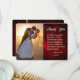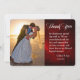 Fotografiet finns på den lämnat sidan av vågräts fotomall bröllop tack vare ditt kort. På högerna står texten "Tack" i ett skript i söt i vitt, följt av ditt eget speciella meddelande. Din anpassningsbar namnteckning och bröllop-datumet ligger på den nedre högerna. Baksidan av inbjudan har samma maronröd övertoningsbakgrund med en elegant silver löv-snurra, tillsammans med berömden "Kärlek"-citat från skriptun. All text är lätt att anpassa till något annat som du föredrar.