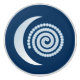 Graderad, silvördig måne åtföljd av ett spiral-nyp av ljus, på mörk blått baksida av himlar på kvällen