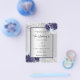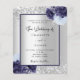 Falsk silverfärgad bakgrund dekorerad med marinblå och ljusblå blommor, blommor och falskt silverglitter, gnistrar. Personifiera och lägg till dina namn och bröllopsdetaljer. Svarta bokstäver.