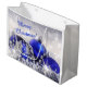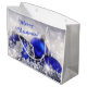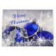 Elegant jul och nyårsaftpåse i silver med blåa julbalkar, vitt mousserande ljus, glansigt tinsel och ett utrymme för din text.