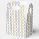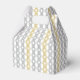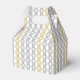 En elegant mönster med geometriska former i silver och guld, som är sammanlänkade med en rad linjära, snöre-strömmare.