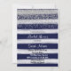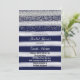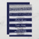 Inbjudningskort för möhippan med silver glitter utformning och marin blå rand vattenfärgbakgrund.