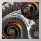 Stunning silver och orange Mandelbrot fractal med spiral och en sfär som reflekterar bilden