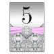 Vacker silverbroderi med tryckt rosa diamantbåge. Lägg till dina detaljer i önskad typsnitt och färg, samt textval på framsidan och baksidan av detta eleganta rosa bordskort.