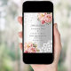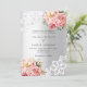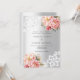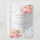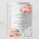 For an elegant and romantic wedding. A faux silver looking background decorated with pink and rose gold florals, roses and white lace. Personalize and add your names and details.