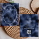 Den här elegantens moderna bröllopsinbjudan innehåller en silver-geometrisk ram som dekoreras med marinblått och silver blommigt buquets på en marinblå faux foil bakgrund. I anpassadet kombineras silver grått med fysisk handskrift, tryckplåt och kursivt typsnitt. Lägg till ytterligare information på baksidan tillsammans med en QR-kod som hjälper dina gäster att besöka webbplatsen för bröllop.