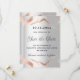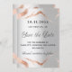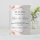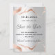 En modern och elegant Spara datum för ett bröllop. En faux silver-tittar bakgrund, dekorerad med marmor från ro guld. Anpassa och lägg till ett datum och din namn. Texten: Spara datumet skrivs med ett stort trendig-handskript i stil. Tillbaka: lägg till URL:en på webbplatsen bröllop.