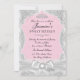 Ljusrosa & Silver Sweet 16-födelsedagsinbjudan. Vacker glänsande damask och juvel-tiara-design. Observera: Alla platta bilder, de har inte riktiga juveler!