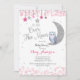 Över Månen Baby Shower Inbjudan för flicka med en måne, stjärnor och vacker falsk guldglitter.