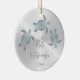 Denna hawaiiska Julgran-dekoration har stamsköldpaddor av elegant silver på en faux-silver-bakgrund, en Mele Kalikimaka-text i ett handskrivet elegant och ett anpassningsbar på framsidan. Ändra anpassningsbarnas familjefoto på baksidan.
