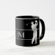 Bilder av en silver silhuette golfer som tar en fullt är på två sidor om mugg. Tunn silver linjer ram, din familj namn, monogram eller annan anpassningsbar i silver mellan bilder. Allt placeras på en dramatisk svart bakgrund. Var du än är, visa alla att du hellre skulle vara golfing!