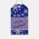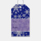 En söt silver snöflinga mönster över en blå bakgrund är utmärkande både på framsidan och baksidan av denna märkre för julklapp. En violett blå banderoll innehåller anpassningsbarnas text mörk blått på båda sidor. *Observera att bilden är utskriven och inte innehåller glitter.