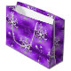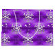 En söt julklapp lila med mönster av stort, silver och vitt snöflingor med små vita stjärnor på dem. De omges också av andra vita stjärnor och glitter. I bakgrunden finns ett mycket färglöst, glansigt lila mönster.