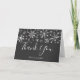 Vintertema bröllop tackkort med silver glitter snöflingor. Texten säger "tack" i skrivstil med nygifta pars namn under.
