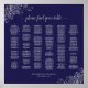Det vackra sätesschemat i bröllop har blek grått-text på en marin blå bakgrund med sätesuppdrag för 200-240 gäster. Den har en enkel men ändå snyggt- och elegant utformning med dekorativa faux foil silver-filigree i hörnen. Titeln skrivs i finare-skriptkalligrafi och lyder: Sök efter bord.
