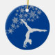Här är en söt julprydnad med en silver-flickgymnast i ett handställ framför en sprej av silver snöflingor. Bilden placeras på en blå bakgrund. Baksidan av dekorationen har samma blå bakgrund och snöflingor, men med två texttexter kan du anpassa fält. Vilken gymnast som helst skulle kärlek göra det här ornamet!
