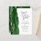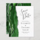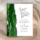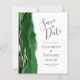 Det moderna bröllop spara datum-kortet från den lämnat kant i eleganten har en vattenfärgad jägare i grönt i gräns som trimmas med faux silver glitter. Med anpassadet kombineras grått-handskrift, tryckplåt och kursivt typsnitt på vit bakgrund. Den omvända sidan har en matchande jägare-grönt och silver-agate-design.