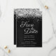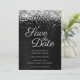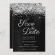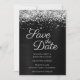 Skapa din egen moderna stil bröllop spara datum. Faux sparkly silvery glitter top kant parad med mörk grått till svart borstad metall-folie i form av borstat malm. Hela struktur i i form av skal, gnistra, metall och glitter skapas med en tryckt digital grafisk bild. Teckensnittet stil och färg kan anpassas.