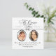 Vacker babyfoto och nuvarande foto svart, vitt och silver Quinceanera-inbjudan. Denna söta då- och nu-foto Quinceanera-inbjudan har eleganta ovala ramar för två bilder - en som bebis och den andra nuvarande. Anpassa denna eleganta svarta, vita och silverfärgade foto Quinceanera-inbjudan genom att lägga till dina foton, evenemangsinformation, typsnitt, teckenstorlek och formulering.