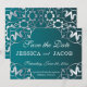 Personlig bröllopsinbjudan med falskt silver filigree laserskuret ram på en teal gradient bakgrund. Texten är helt anpassningsbar.
