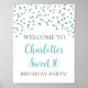 Anpassningsbar 16 födelsedagsfester poster med silver och turkoskonetti.