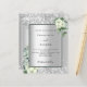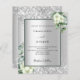 Falskt silverfärgat bakgrund dekorerat med vita blommor, eucalyptusgrönska och falska silverglitter. Personifiera och lägg till era namn och bröllopsdetaljer. Svarta bokstäver.