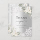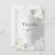 Ett modernt och elegant tackkort utan foto. En falsk silverfärgad bakgrund. Dekorerad med vita rosor, blomstermotiv och spets. På framsidan texten: Tack