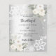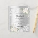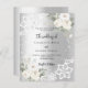 För en elegant och ett romantiskt bröllop. En faux silver tittar bakgrund som dekoreras med vita blommigtar, ro, vita snöre och faux-diamanter. Anpassa och lägg till namn och information. 1 lakan = 1 inbjudan tryckt kant till kant.