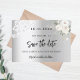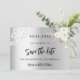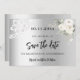 En modern och elegant Spara datum i 50:e födelsedagsfesten. En faux silver-tittar bakgrund, dekorerad med vita blommor och vita snöre. Anpassa och lägg till ett datum och namn. Texten: Spara datumet skrivs med ett stort trendig-handskript i stil.