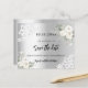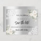 En modern och elegant Spara datum i 50:e födelsedagsfesten. En faux silver-tittar bakgrund, dekorerad med vita blommor och vita snöre. Anpassa och lägg till ett datum och namn. Texten: Spara datumet skrivs med ett stort trendig-handskript i stil. 1 lakan = 1 inbjudan tryckt kant till kant.