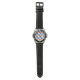 Silver watch with a colorful geometric mosaic dial, featuring a black bezel with white numbers. Black leather strap with white stitching. Elegant style.
