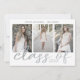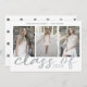 Tre fotokollage med anpassningsbar vismisk skript "klass av" i silver faux foil med år i samma färg. All information finns i sans serif elegant font överst på kortet. Baksidan är silver polka punkt glitter mönster. Gör vackra meddelanden om anpassningsbarna med enkel anpassning.
