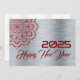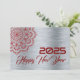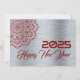 Greeting wish card Happy New Year written in English in red font with mandala on a silver background - editable text and background
