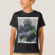 Gorillasitta som leker med bambuvasser, svärtar t-skjortan.