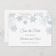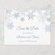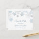 Jul tema bröllop spara datumet vykort med silverblå snöflingor. Perfekt för eleganta vinterbröllop och andra säsongs- och högtidsfiranden.