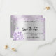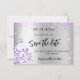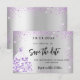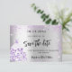 En modern falsk silverfärgad bakgrund dekorerad med lila falskt glitter, gnistrande och en klänning. Anpassa och lägg till ett datum och namn. Texten: Spara datumet är skriven med en stor trendig handskriven stil.
