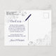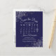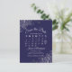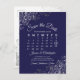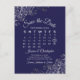 Detta vackra spara-datum-vykort kommer att ge dina vänner och familj förhandsbesked om ditt kommande bröllop. Det har en smart design med en anpassad kalender där du kan sätta ett hjärta runt ditt bröllopsdatum. Bakgrunden är marinblå, med ljust grå text och dekorativa silvergrå falska foliefransar i hörnen. Baksidan har en söt grafik som lyder "skriv in oss" med utrymme för din egen anpassade anteckning.