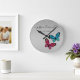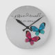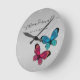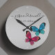 Vacker, sammanlänkad av kärlek, silvergrå väggklocka som firar ett par och deras kärlek. Personliggjord med parets namn skrivna i kursiv stil och sammanbundna med ett virvlande hjärta. Den är dessutom personliggjord med ett anpassat datum. Dekorerad med en söt illustration av två fjärilar, en lila och en blå. Trendig, modern och elegant present till ett par som kommer att ha både ett praktiskt och dekorativt värde. Du kan göra det till en årsdagspresent, en bröllopspresent eller en förlovningspresent och ja, det är helt oproblematiskt om det är en present du ger till dig själv och din partner för att fira din vackra kärlekssammanlänkning.