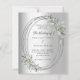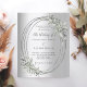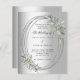 En falsk silverfärgad bakgrund. En oval silverram dekorerad med grönska i grågrönt. Personifiera och lägg till era namn och detaljer. Svart text.
