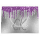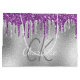 En falsk silvermetallisk bakgrund med lila falska glitterdroppar, målningsdroppande look. Anpassa och lägg till ett namn och monograminitialer. Namnet skrivs med en modern handskriven stilsnitt. Vita och grå bokstäver. Perfekt för födelsedagar, bröllopsfest, baby shower.