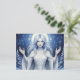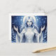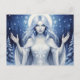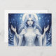 This fantasy postcard features an ethereal winter goddess with flowing silver hair and glowing halo, surrounded by snowflakes and a moonlit forest, symbolizing purity and the magic of winter. Finished as an acrylic oil paint print.