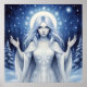 This fantasy poster features an ethereal winter goddess with flowing silver hair and glowing halo, surrounded by snowflakes and a moonlit forest, symbolizing purity and the magic of winter. Finished as an oil acrylic paint print.