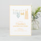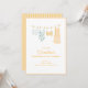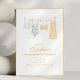 Denna möhippa-inbjudan har en akvarellillustration av simdrakter som hänger på ett klädstreck — en tankini, en tryckt enkeltdräkt, en gul bikini och en randig överdel — med en guldkant och alla fester detaljer nedan i varmgul text. Perfekt för en strand-, pool- eller destination möhippa helg.